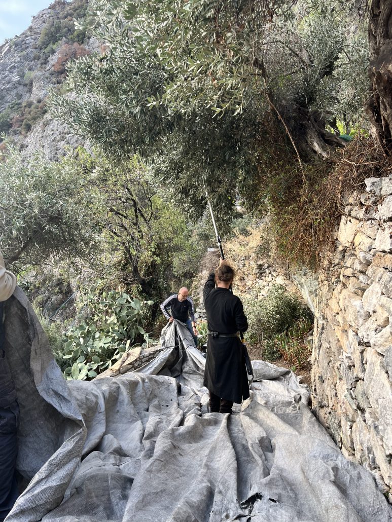 It was mid-summer when a letter arrived from Greece – receiving a letter from Greece was always a thrilling event. It was from my good friend Father S, who tended humble olive groves on the steep slopes of Katounakia in the Southern and least accessible part of Mount Athos. His script, careful and sparse, conveyed a simple request: Help was needed to bring in this year’s harvest. The prospect of journeying to such a remote and revered place, where silence is sacred and time seems to linger, filled me with both excitement and reverence. I reached out to some fellow members of FoMA, now friends, to help. They were thrilled with the invite.